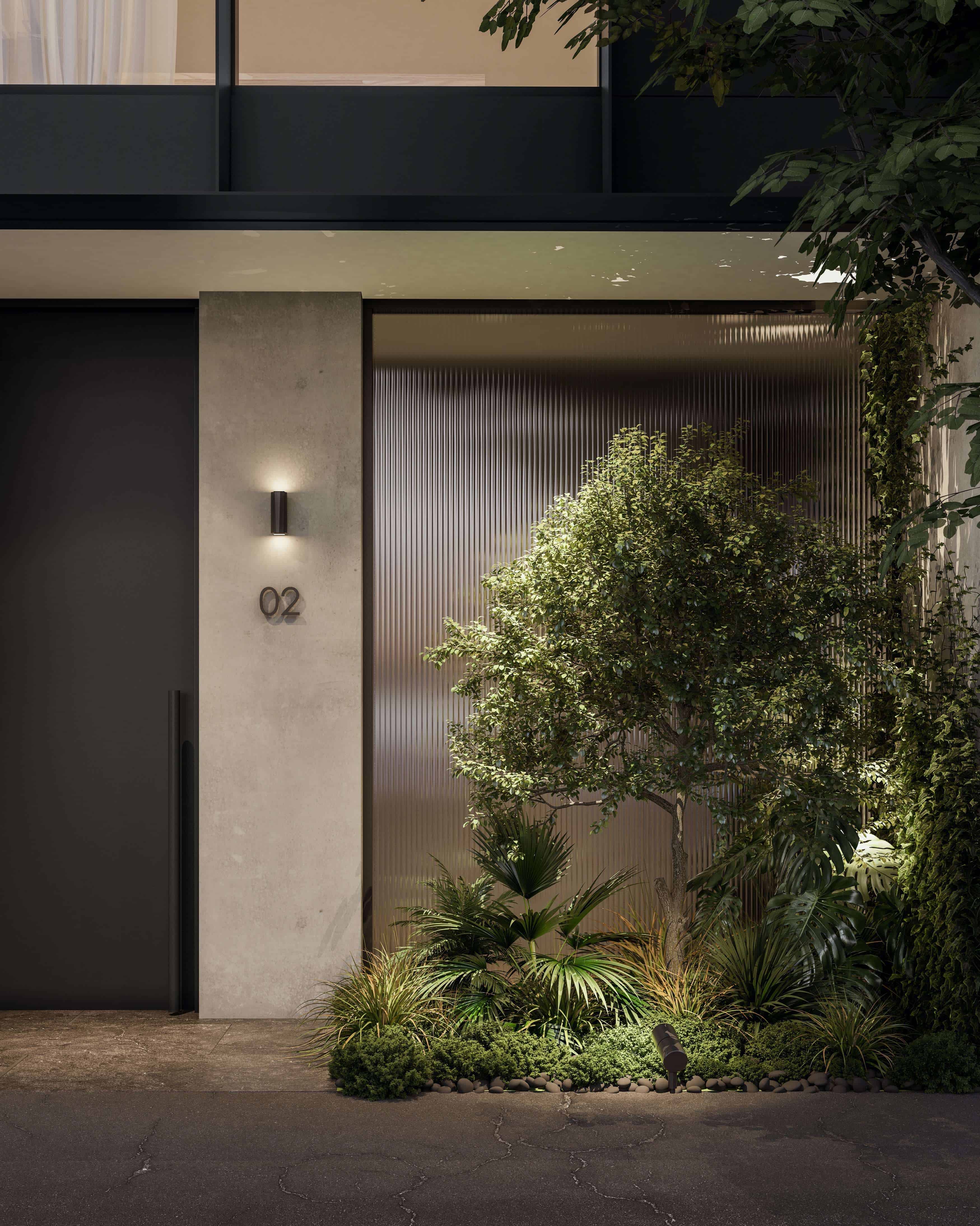A traditional yet sophisticated palette of materials has been chosen to emphasize the minimalistic, refined form of this modern home. The main building element consists of traditional brick work, painted to impose the state of the art technology behind the door. Operable metal screens enhance privacy whilst layering texture and articulation to the elevations.